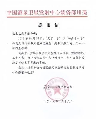 時(shí)間拉回八年前,遠(yuǎn)東電纜收到過一封來自酒泉衛(wèi)星發(fā)射中心的感謝信,記錄了“緊急時(shí)刻”下遠(yuǎn)東電纜與中國航天的鏈接。2016年9月16日晚近12時(shí),“神舟十一號(hào)”發(fā)射工作已經(jīng)進(jìn)入調(diào)試階段,遠(yuǎn)東電纜突然接到來自酒泉衛(wèi)星發(fā)射中心的電話,中心表示希望公司能在三天內(nèi),趕制一批航空用高端電纜產(chǎn)品并送至酒泉,助力航天基地建設(shè)及“神州十一號(hào)”發(fā)射。“公司接到任務(wù)快速反應(yīng),全力趕工,最終用72小時(shí)的“火箭速度”不辱使命交上滿意答卷?!边h(yuǎn)東電纜相關(guān)負(fù)責(zé)人表示。