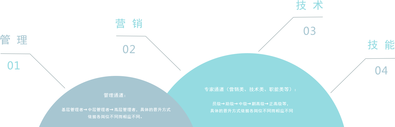 職業(yè)發(fā)展路徑包括管理、技術(shù)、營(yíng)銷、技能四類,可根據(jù)自身職業(yè)發(fā)展規(guī)劃選擇在相應(yīng)路徑上不斷成長(zhǎng)發(fā)展,也可在成長(zhǎng)過程中,結(jié)合自身意愿,通過自身努力,跨路徑成長(zhǎng)