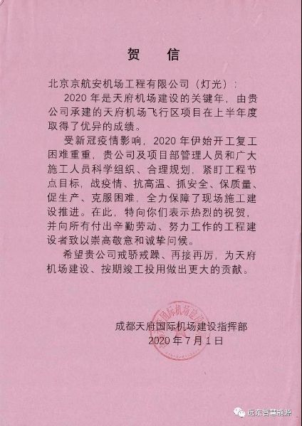 “2020年是天府機(jī)場(chǎng)建設(shè)的關(guān)鍵年,由貴公司承建的天府機(jī)場(chǎng)飛行區(qū)項(xiàng)目在上半年度取得了優(yōu)異的成績(jī)。