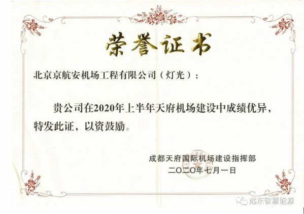 近日,遠(yuǎn)東智慧能源股份有限公司(股票代碼:600869 簡(jiǎn)稱:智慧能源)旗下北京京航安機(jī)場(chǎng)工程有限公司(簡(jiǎn)稱:京航安)接到了來(lái)自成都天府國(guó)際機(jī)場(chǎng)建設(shè)指揮部的榮譽(yù)證書與賀信,以祝賀京航安在成都天府國(guó)際機(jī)場(chǎng)項(xiàng)目中順利推進(jìn)建設(shè)進(jìn)度,取得優(yōu)異成績(jī)。